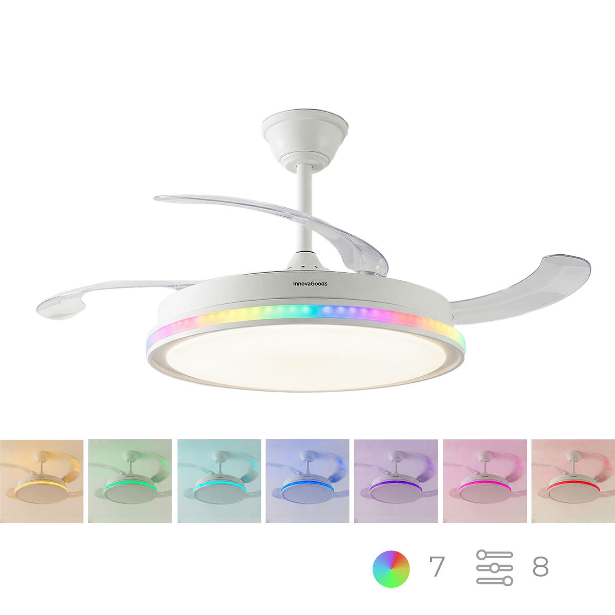 Loftventilator med RGB LED-lys, 4 sammenklappelige vinger og fjernbetjening InnovaGoods ! Se det store udvalg af produkter af høj kvalitet, der skiller sig ud for deres funktionalitet, effektivitet og innovative design: belysning, opbevaring, dekoration, aircondition, have, kæledyr, rengøring mv.