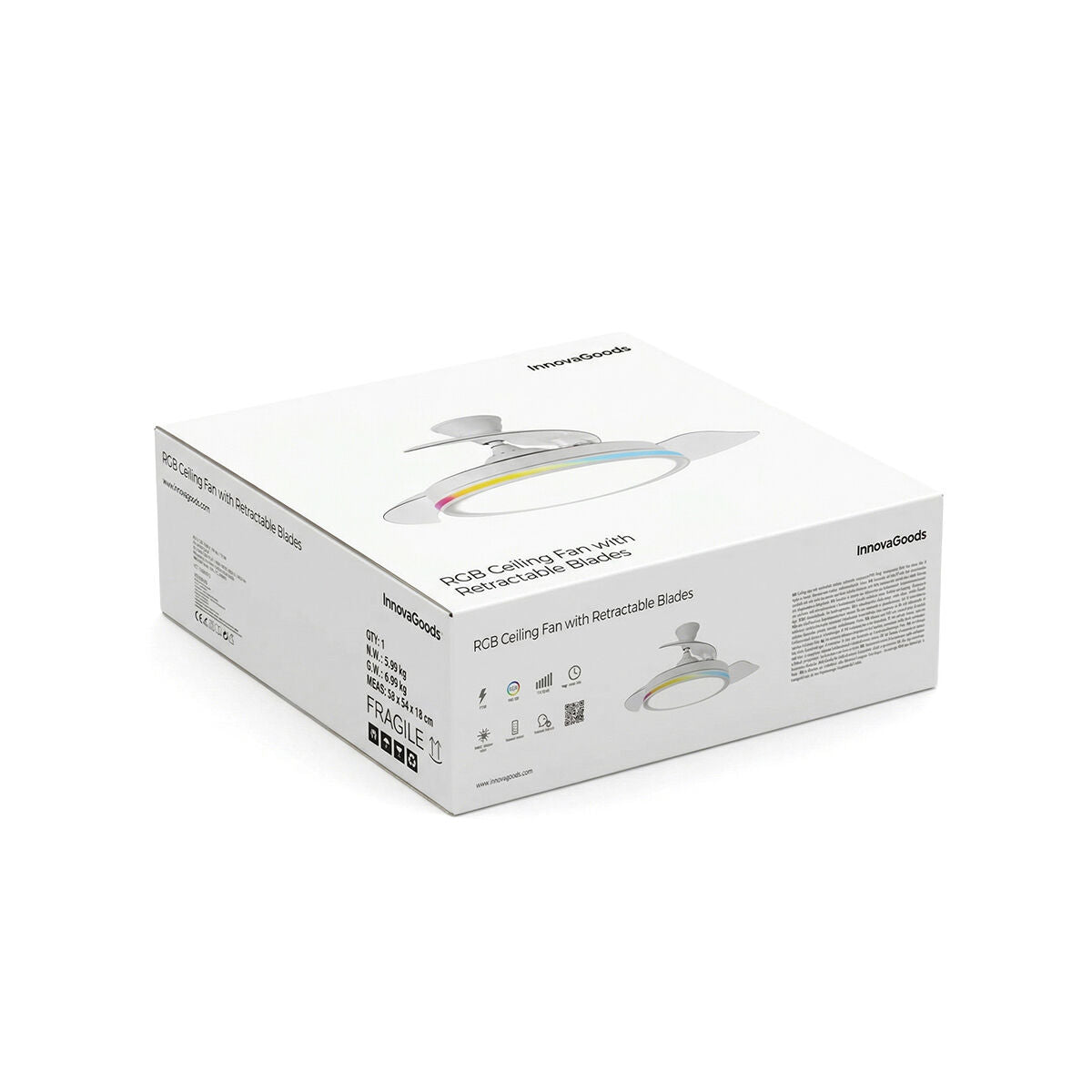 Denne loftventilator med LED RGB-lys og indtrækkelige vinger kombinerer komfort, stil, kraft og effektivitet og skaber et personligt velværemiljø. Med centralt LED-lys med 3 farvetoner og dæmpbar lysstyrke samt RGB-ring med 7 farver og 8 dynamiske sekvenser. Støjsvag, 6 hastigheder, timer, sommer/vinter-funktion, DC-motor og fjernbetjening for nem styring. Ideel til rum op til 25 m².