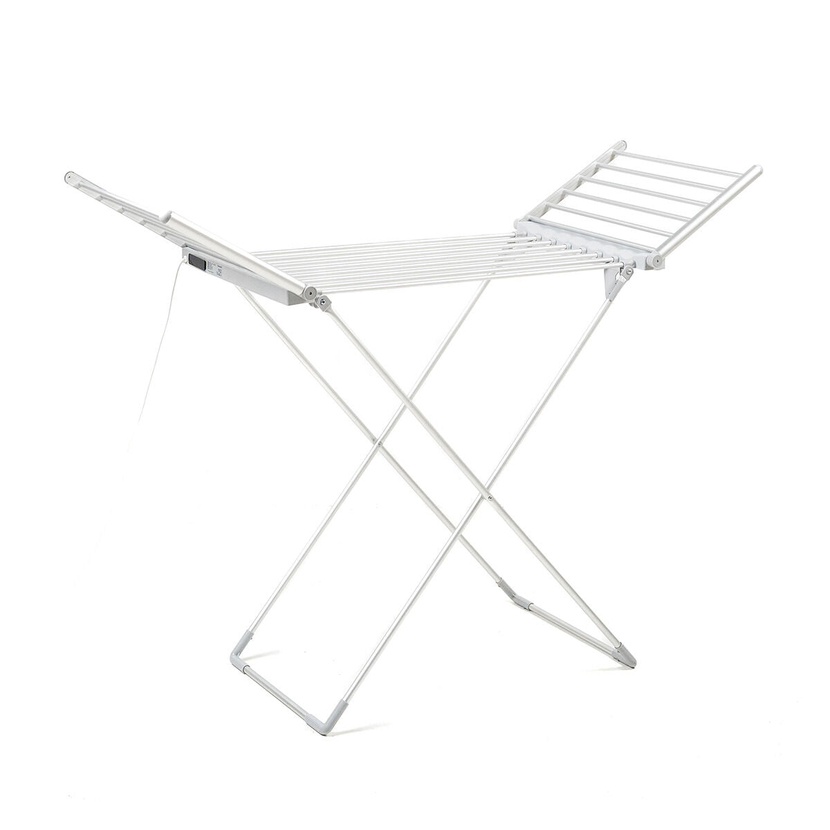 Denne sammenklappelige elektriske tørrestativ med vinger fremskynder tørring af tøj med sine 20 opvarmede stænger. Ideel om vinteren, på regnfulde eller fugtige dage.